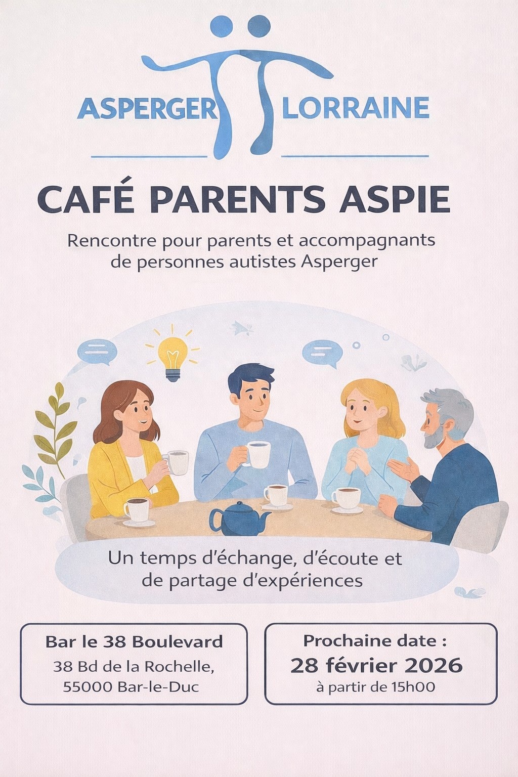 Café parents aspie Bar-le-Duc 15 h 00 min 28 février 2026 Bar le 3838 Boulevard de la RochelleBar-le-Duc, 55000View LocationCarte Bar le 38 Voir le calendrier complet
